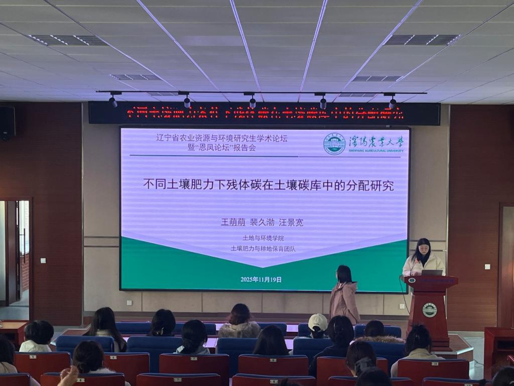 2025年11月19日,第十四期辽宁省农业资源与环境研究生学术论坛暨“恩凤论坛”报告会在土壤楼A座226报告厅成功举行。本次论坛特邀土壤肥力与耕地保育团队的2023级博士生王萌萌进行学术汇报,报告题目为“不同土壤肥力条件下残体碳在土壤碳库中的分配研究”。刘旭老师主持本次会议。